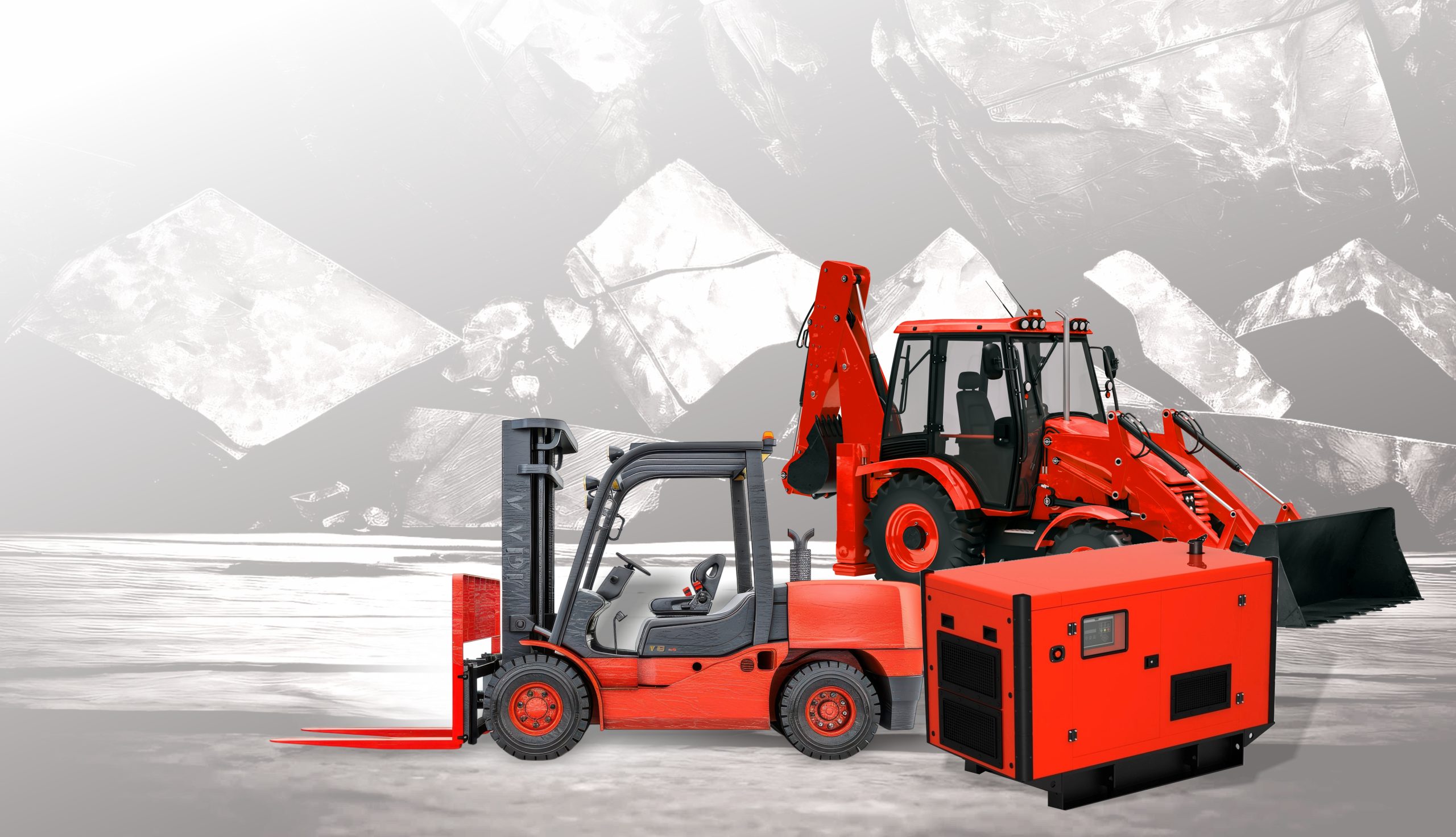 Rolos compactadores, pavimentadoras, varredoras, martelos hidráulicos e fresadoras, plataformas elevatórias e geradores.